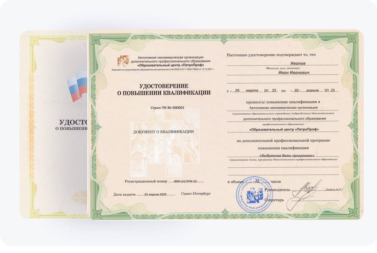 У нас предусмотрены качественные программы повышения квалификации, разработанные с учетом образовательных стандартов и требований. Они отличаются структурированным материалом и большим объемом информации. Преподаватели центра "ПетроПроф" при необходимости помогут разобраться с трудными моментами. По итогам обучения выпускникам выдается УПК, подтверждающее обновление знаний и наличие необходимых профессиональных компетенций у специалиста.